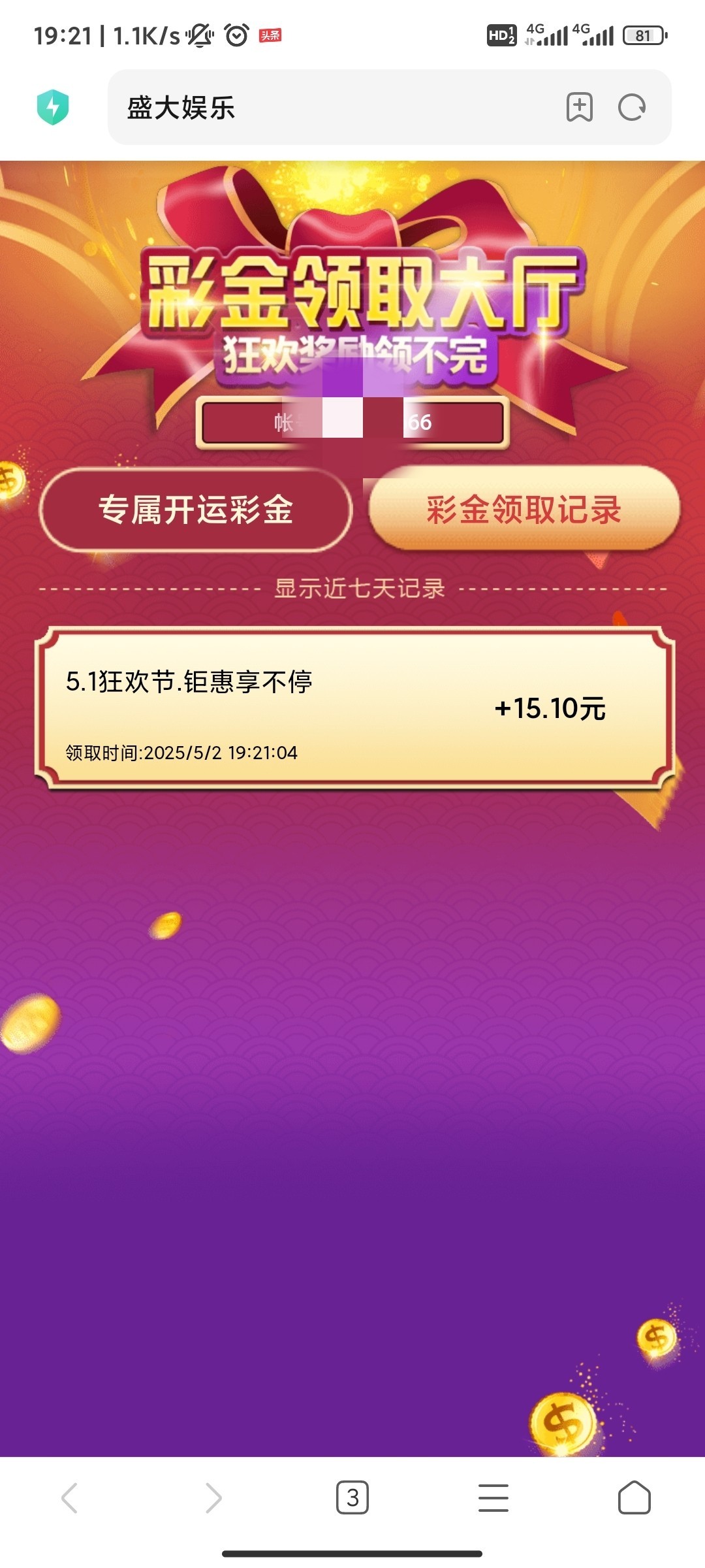 自己到个人中心彩金大厅领取,sdyl.com