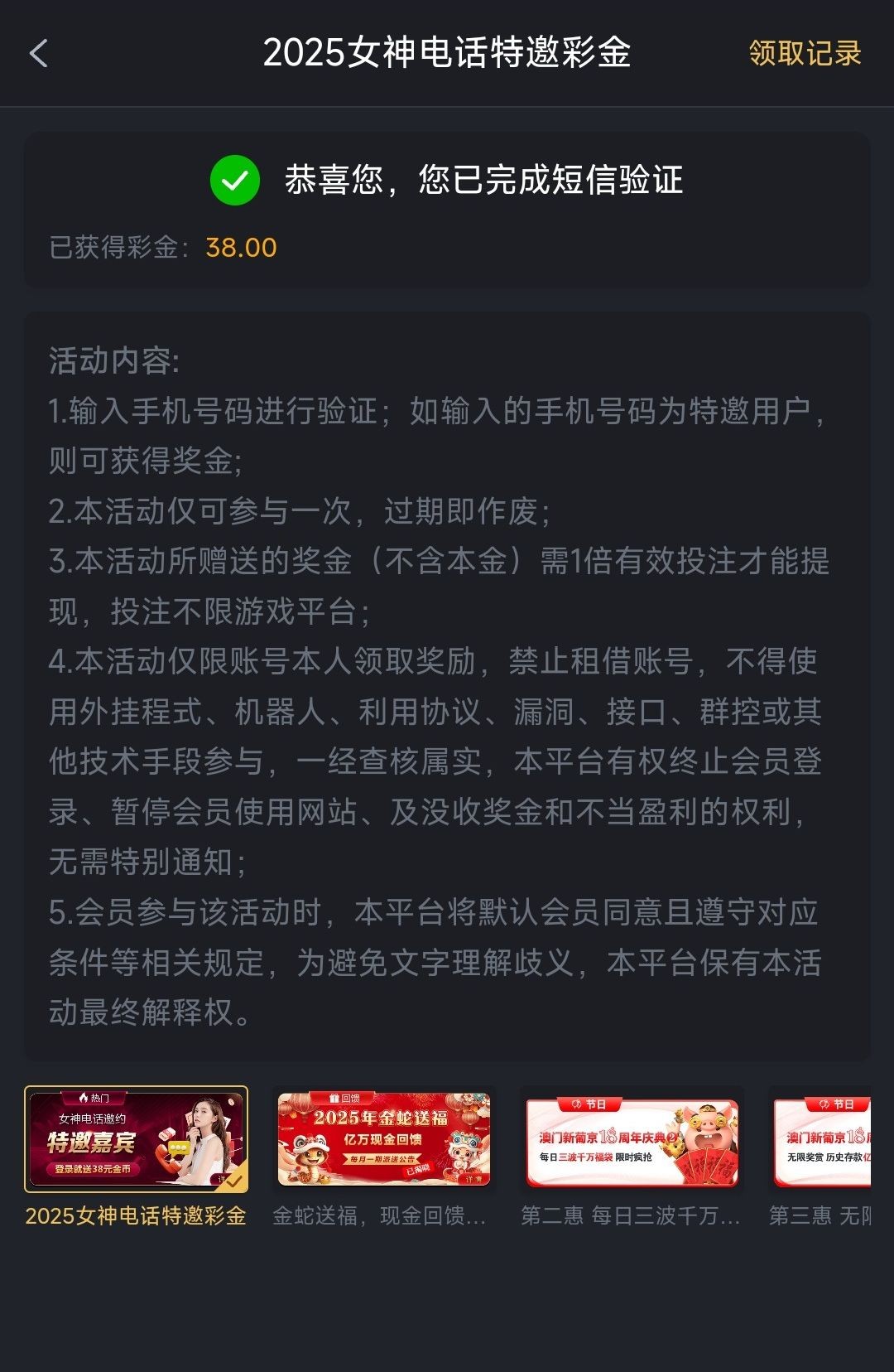 特邀碰瓷,活动里领38,没有资格就说明你手机号注册的平台还不够多,一般这种过段时间在去看就有资格了。