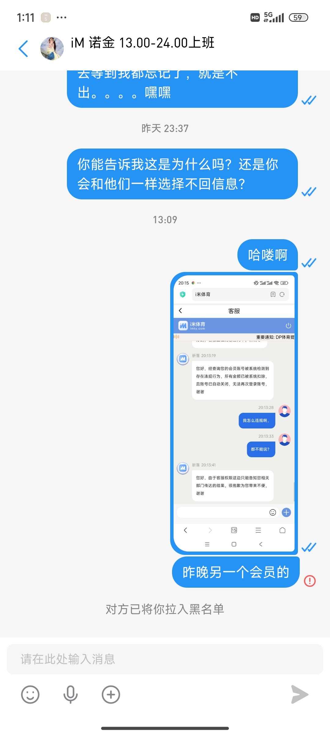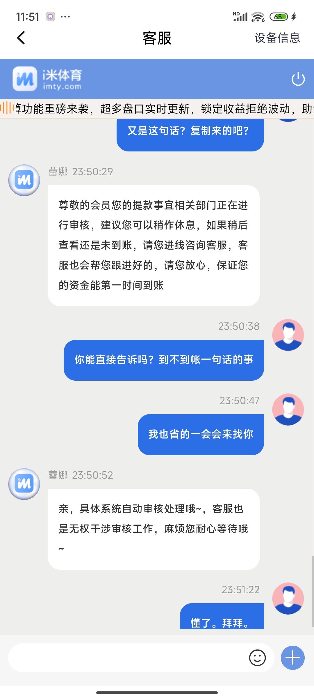 今天接到i米提现的电话特邀,送了58,三倍流水提款,打了三倍流水,提100,全程打麻1,提款的时候就一直卡我,不给出款,让客服退回,客服不给退回,问了就说让等,到现在23点55分,6个多小时不给出款。软件客服早些时候还跟我说让我赢了就提款,我找软件客服,结果它也是不回信息了。网址imty.com