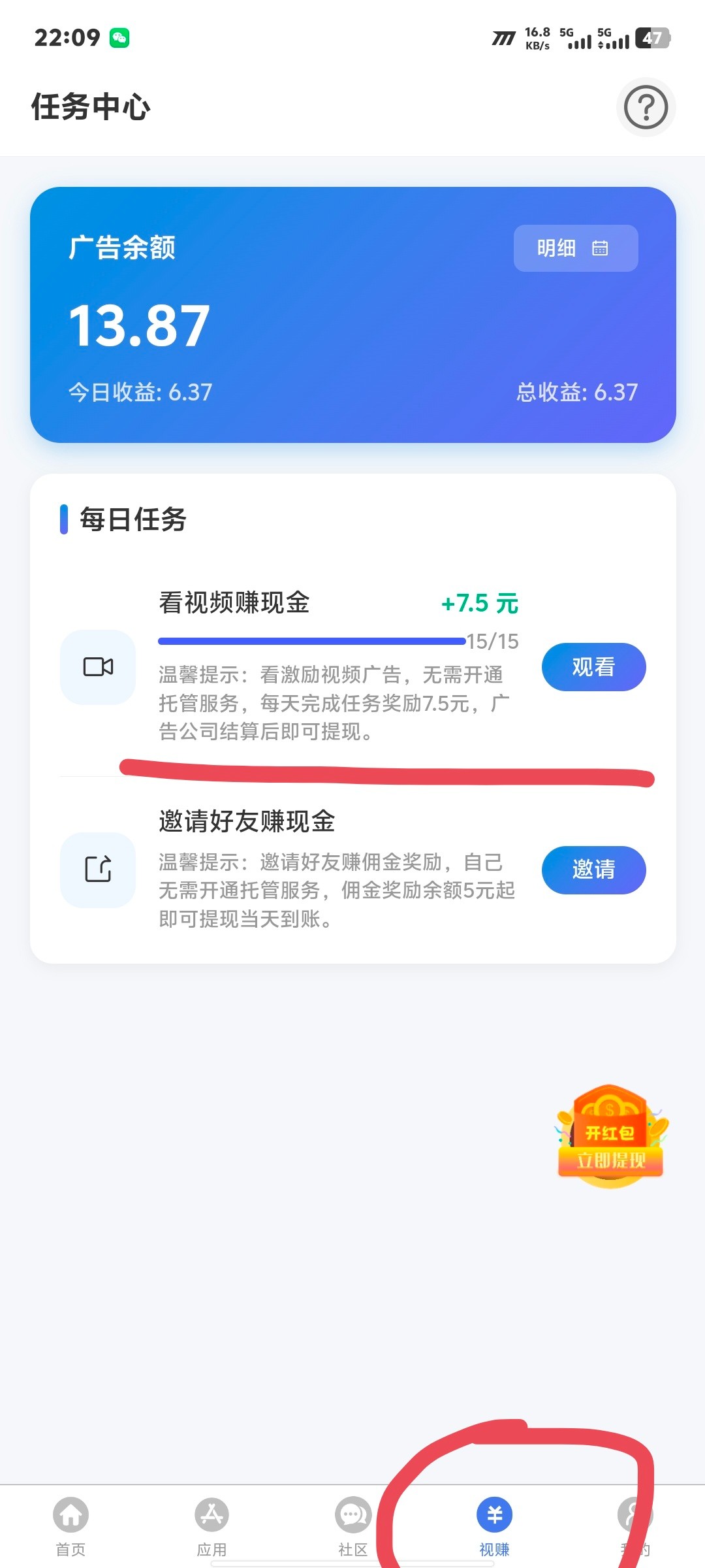 每天有10次提现机会,首次满5就可以提,看视频还能领自己测一下吧,或者等我满了之后我给大家说