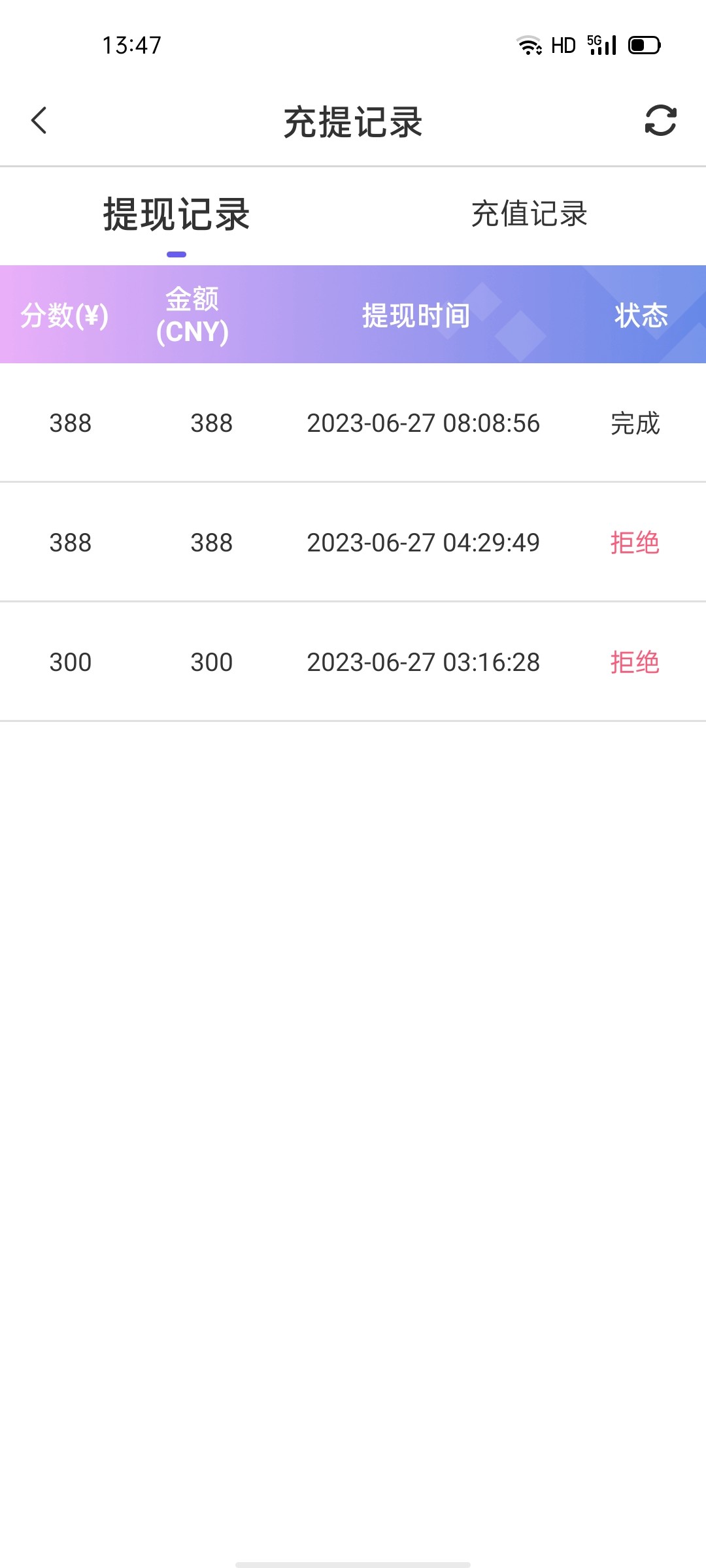 有点黑,58打到300,充了100,提了377,提现拒绝,充值100退回账户了