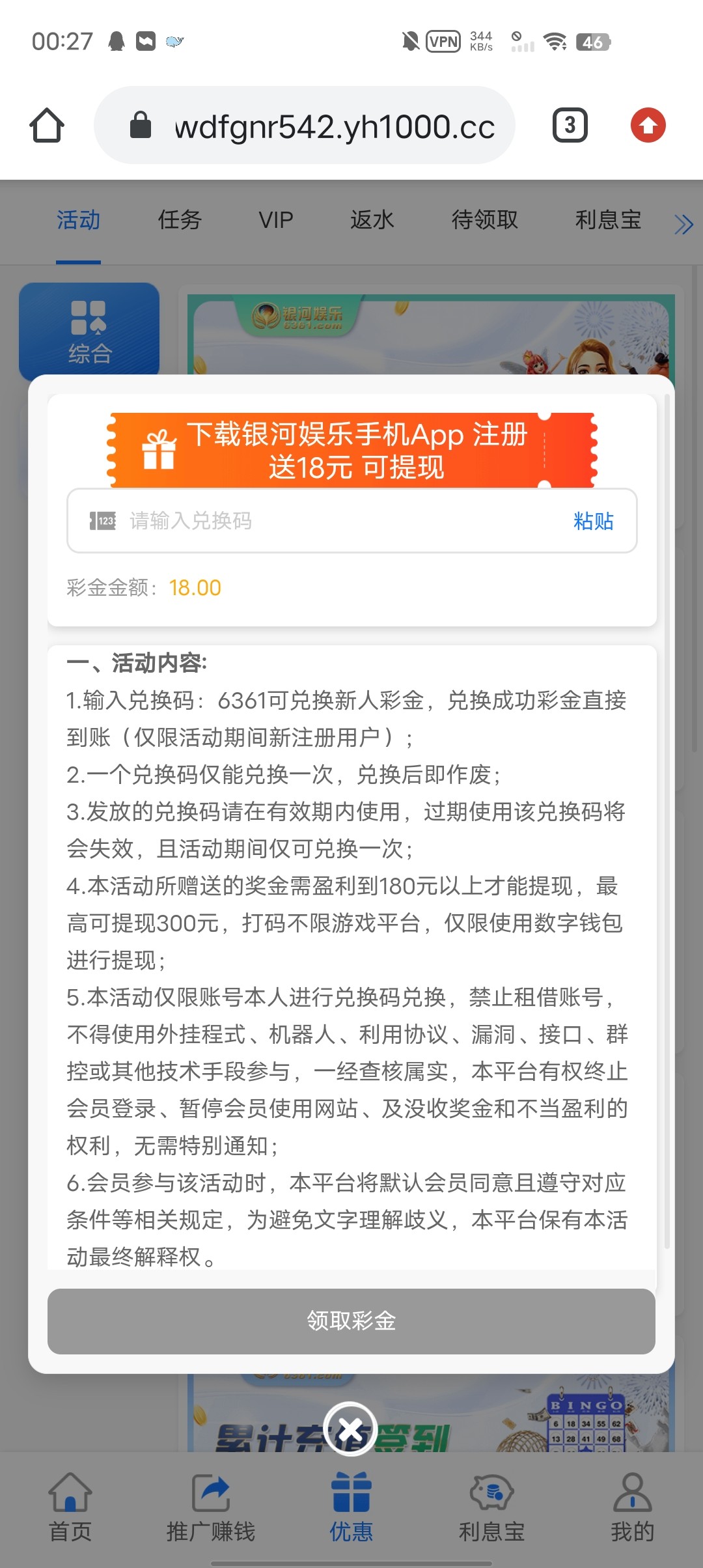 新用户下载APP绑定NO钱包然后去优惠大厅自助领取18彩金,兑换码6361,看到速去人多易黄,不知道是不是特邀才有自测吧勿充值。